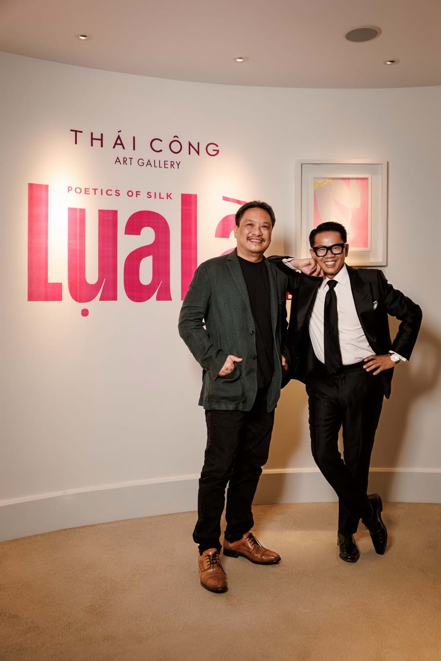 Nhà thiết kế Thái Công (phải) trở thành giám tuyển của tranh lụa Bùi Tiến Tuấn cho lần ra mắt Thái Công Art Gallery. Ảnh: NVCC.