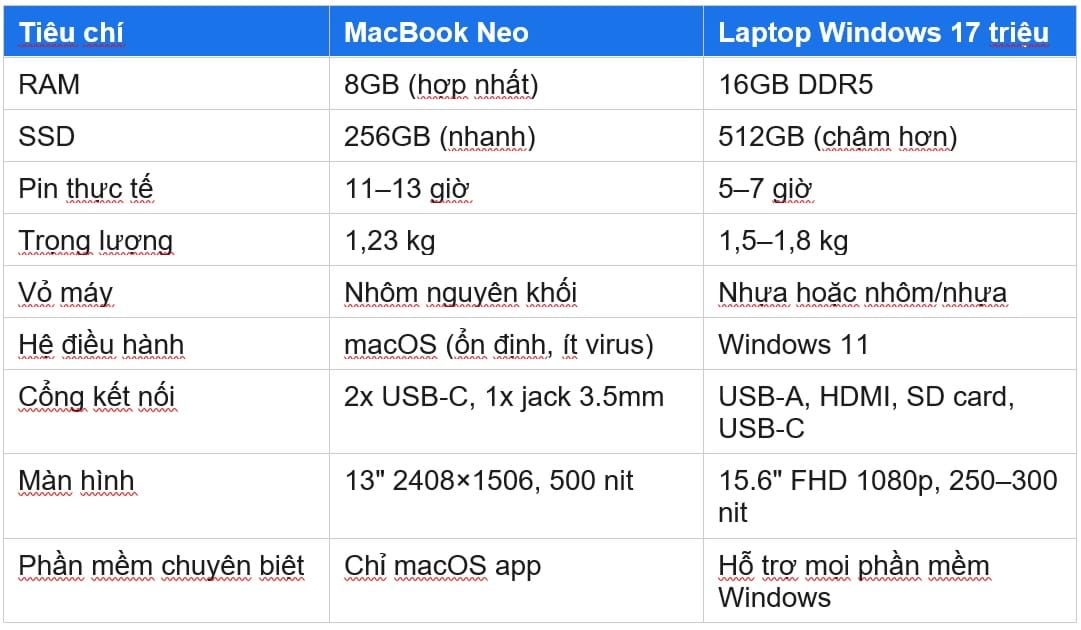 So sánh trực tiếp: MacBook Neo và laptop Windows 17 triệu
