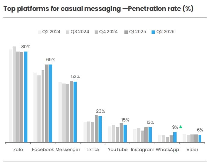 Dữ liệu từ báo cáo The Connected Consumer quý II.2025 của Decision Lab cho thấy, Zalo tiếp tục dẫn đầu các nền tảng nhắn tin tại Việt Nam cả về tỷ lệ sử dụng và mức độ yêu thích. Có tới 80% người được khảo sát cho biết sử dụng Zalo để trao đổi hằng ngày – vượt xa các nền tảng khác như Facebook (69%), Messenger (53%), trong khi YouTube, Instagram, WhatsApp và Viber chỉ đạt từ 6% đến 15%.
