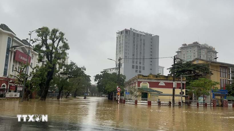 Nhiều tuyến đường chính ở thành phố Huế vẫn còn ngập sâu. Ảnh: Văn Dũng/TTXVN