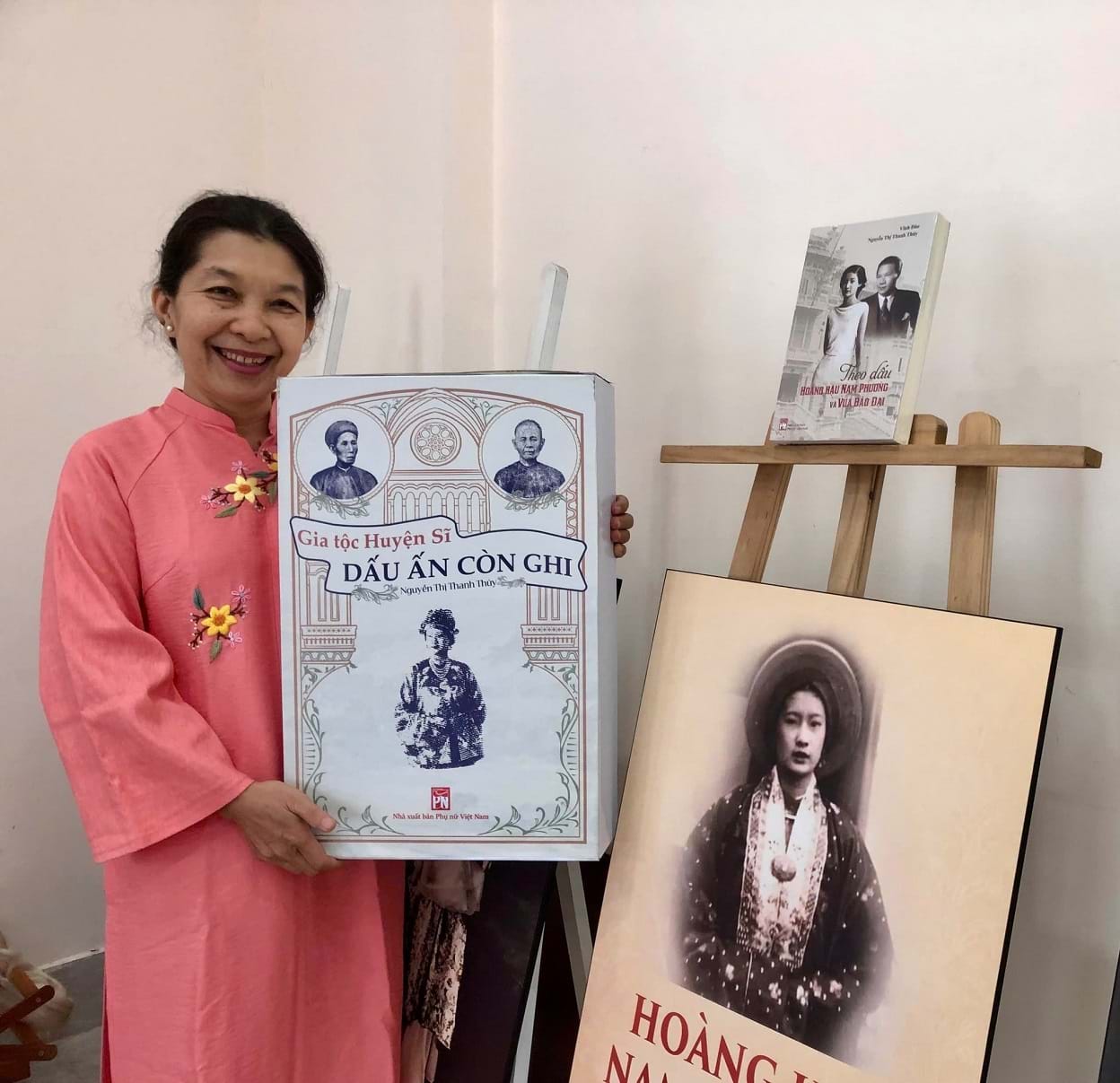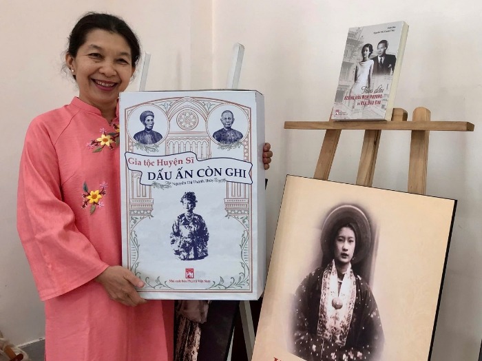 Tác giả Nguyễn Thị Thanh Thúy cùng các công trình theo dấu Hoàng hậu Nam Phương. Ảnh: TGCC