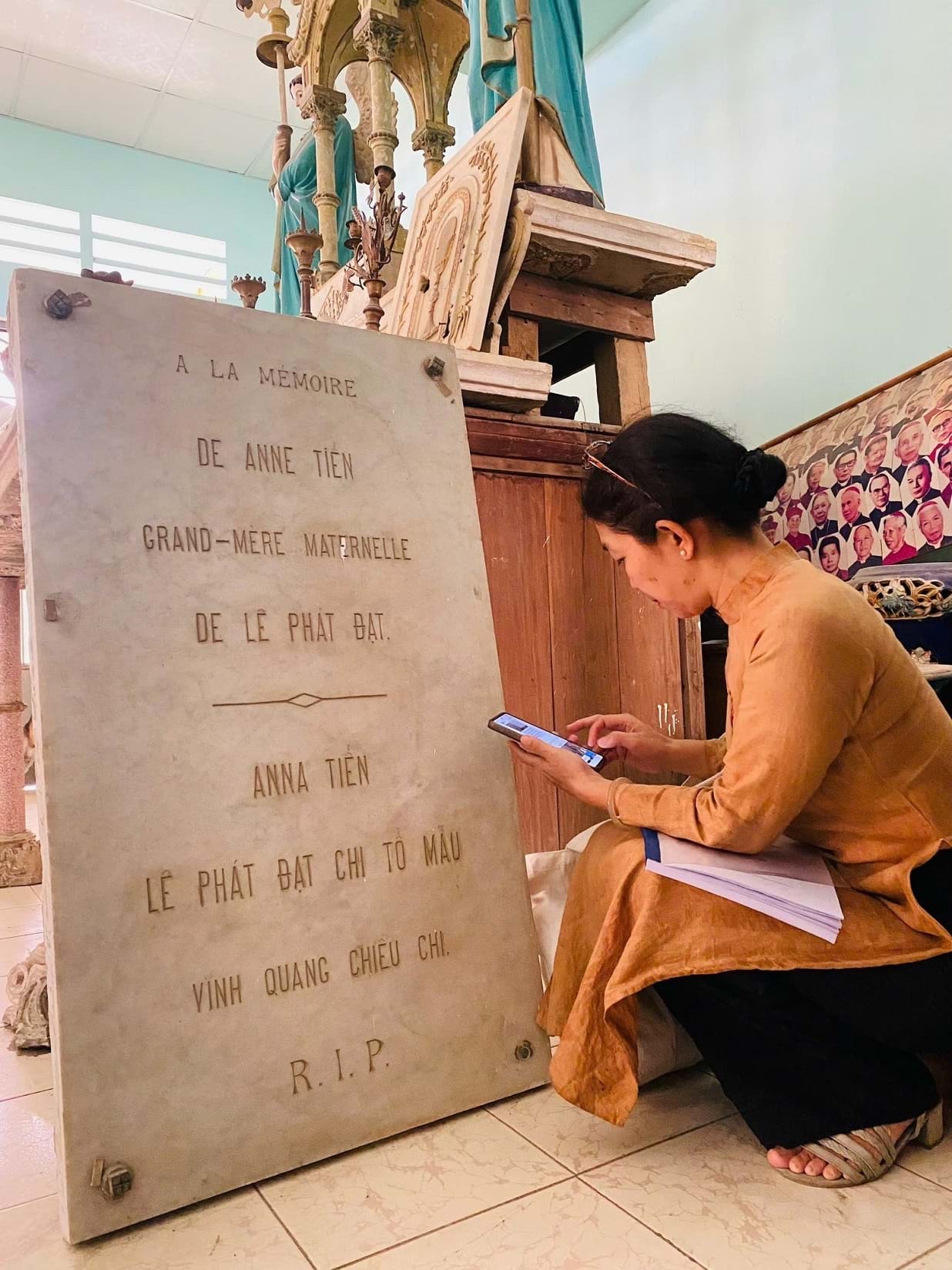 Tác giả bên bia tưởng nhớ bà nội của Huyện sĩ Lê Phát Đạt đặt tại nhà truyền thống của Giáo xứ Tân Triều. Ảnh: TGCC
