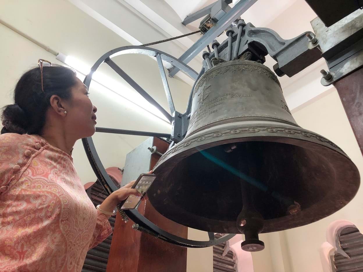 Tác giả bên chiếc chuông tại nhà nguyện của nhà dưỡng lão Thị Nghè do ông bà Huyện Sĩ dâng vào năm 1896. Ảnh: TGCC.