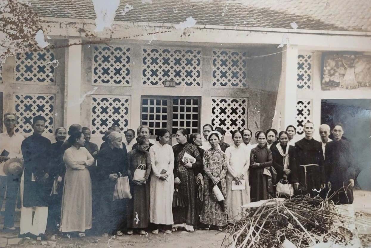 Thầy cô của trường Tiểu học tư thục Lê Văn Gẫm vào thập niên 1960. Đây là công trình được gia đình Huyện sĩ đóng góp xây dựng. Ảnh: Album dòng họ Lê Phát - Lê Văn.