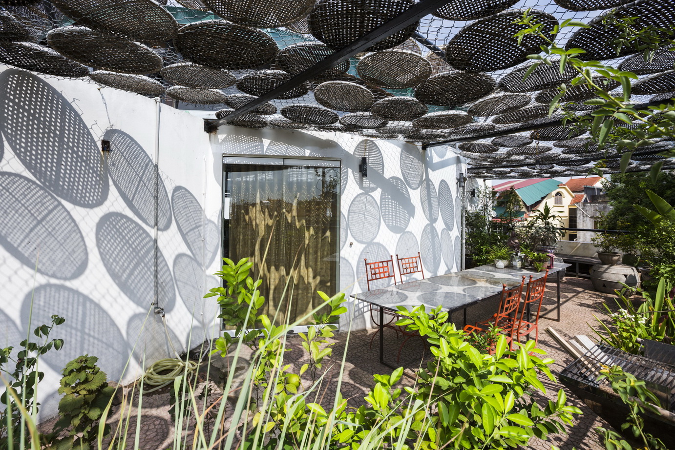 Điều thú vị ở công trình này là cảnh quan tự thay đổi theo thời gian, hướng nắng thay đổi và kết hợp với các bề mặt vật liệu tạo ra những hiệu ứng hình học đa dạng. Đối lập với hình ảnh “động” bên hiên mở phía đông, hiên phía tây được đóng kín và trở nên “tĩnh”. Con người như lắng đọng lại và quan sát kỹ hơn họa tiết nan tre đan chồng lớp lên nhau, trong một không gian ở ấm cúng, nhẹ nhàng.