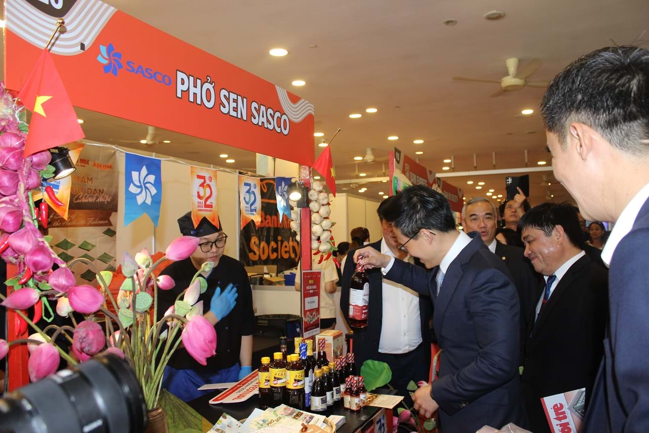 Đông đảo quan khách tham quan gian hàng SASCO với điểm nhấn là món Phở Sen và nước mắm Uncle Ba.