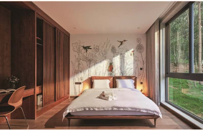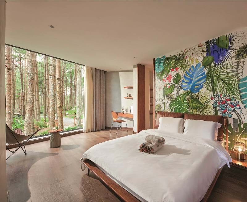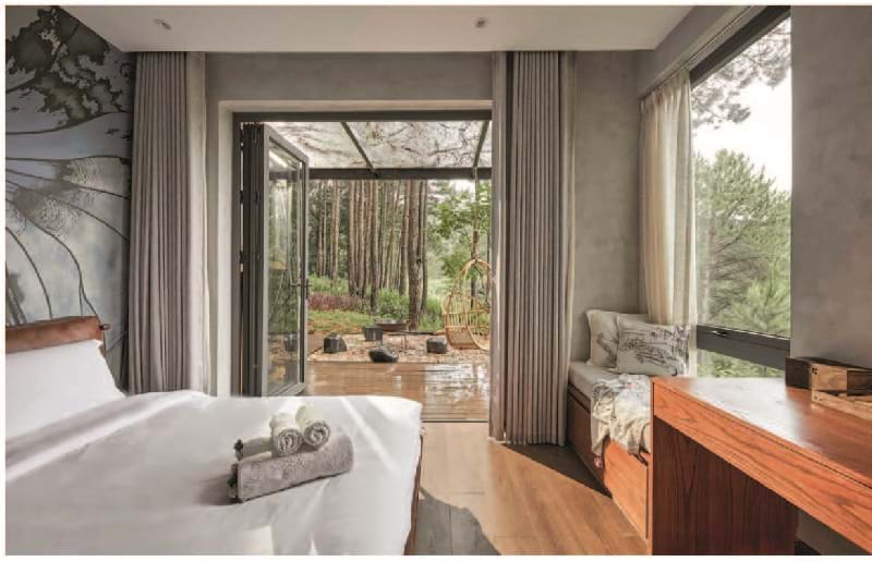 Cảnh trí bài biện mộc mạc, gần gũi. Các căn phòng bắt trọn view rừng qua những ô cửa kính lớn.
