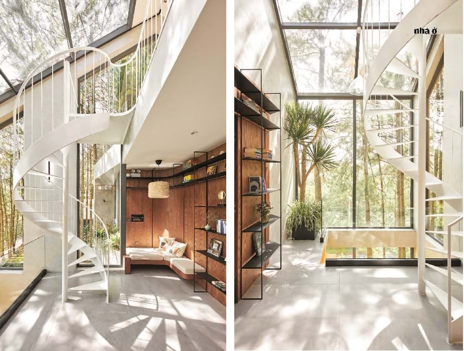 Cầu thang xoắn cũng là một điểm nhấn khá độc đáo cho ngôi nhà. Mái nhà được lắp kính để lấy ánh sáng tự nhiên.