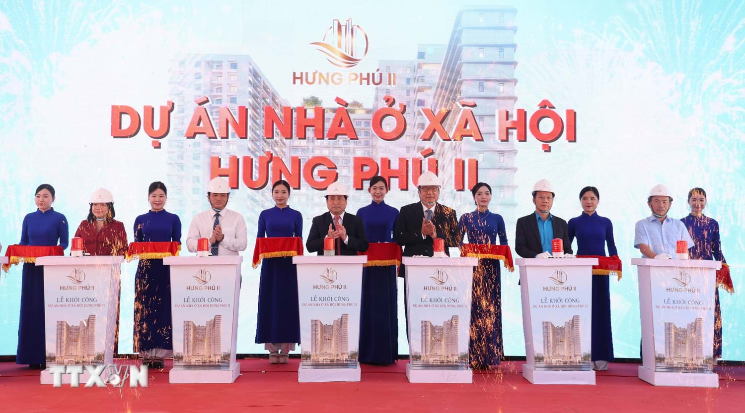Các đại biểu thực hiện nghi thức khởi công dự án nhà ở xã hội. Ảnh: Đặng Tuấn/TTXVN