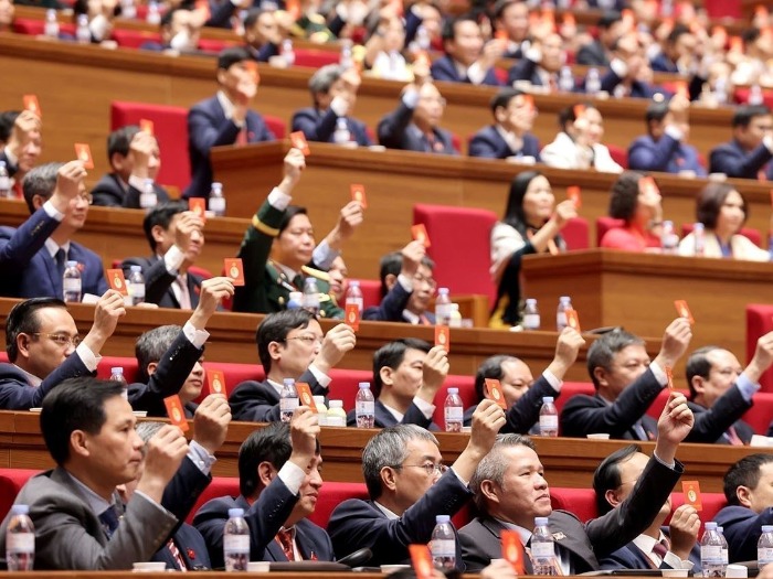 Đại hội biểu quyết thông qua dự thảo Chương trình điều chỉnh chương trình Đại hội XIV của Đảng. Ảnh: TTXVN
