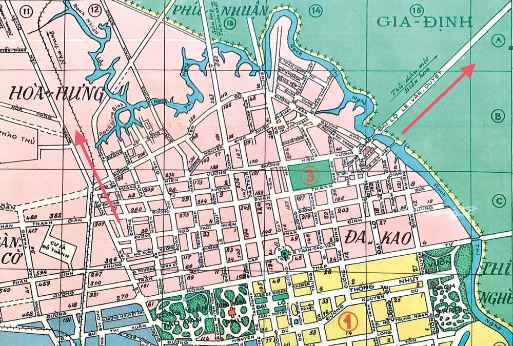 Đã từng có hai đại lộ Lê Văn Duyệt tại Sài Gòn từ 1955-1975 (vị trí mũi tên). Bản đồ Sài Gòn - Chợ Lớn năm 1956 cho thấy đại lộ Lê Văn Duyệt trên địa bàn Đô thành Sài Gòn, bắt đầu từ Ngã sáu Sài Gòn (nơi đặt tượng Phù Đổng Thiên Vương sau này) kéo dài lên Ngã tư Bảy Hiền hướng đi Tây Ninh và Campuchia (nay là đường Cách Mạng Tháng Tám). Còn đại lộ Lê Văn Duyệt thứ hai, nằm trên địa bàn tỉnh Gia Định (sau tháng 4.1975, Sài Gòn và Gia Định hợp nhất), bắt đầu từ Cầu Bông qua Lăng Ông hướng đi Thủ Dầu Một và Biên Hòa, nối tiếp đường Đinh Tiên Hoàng của quận Một (tư liệu của tác giả). Sau tháng 4.1975, đường Lê Văn Duyệt bị nhập vào đường Đinh Tiên Hoàng. Nếu trở lại tên hai con đường riêng biệt thì vẫn đảm bảo giá trị lịch sử đồng thời không ảnh hưởng đến việc phân biệt số nhà và địa giới! Ảnh: TLTG