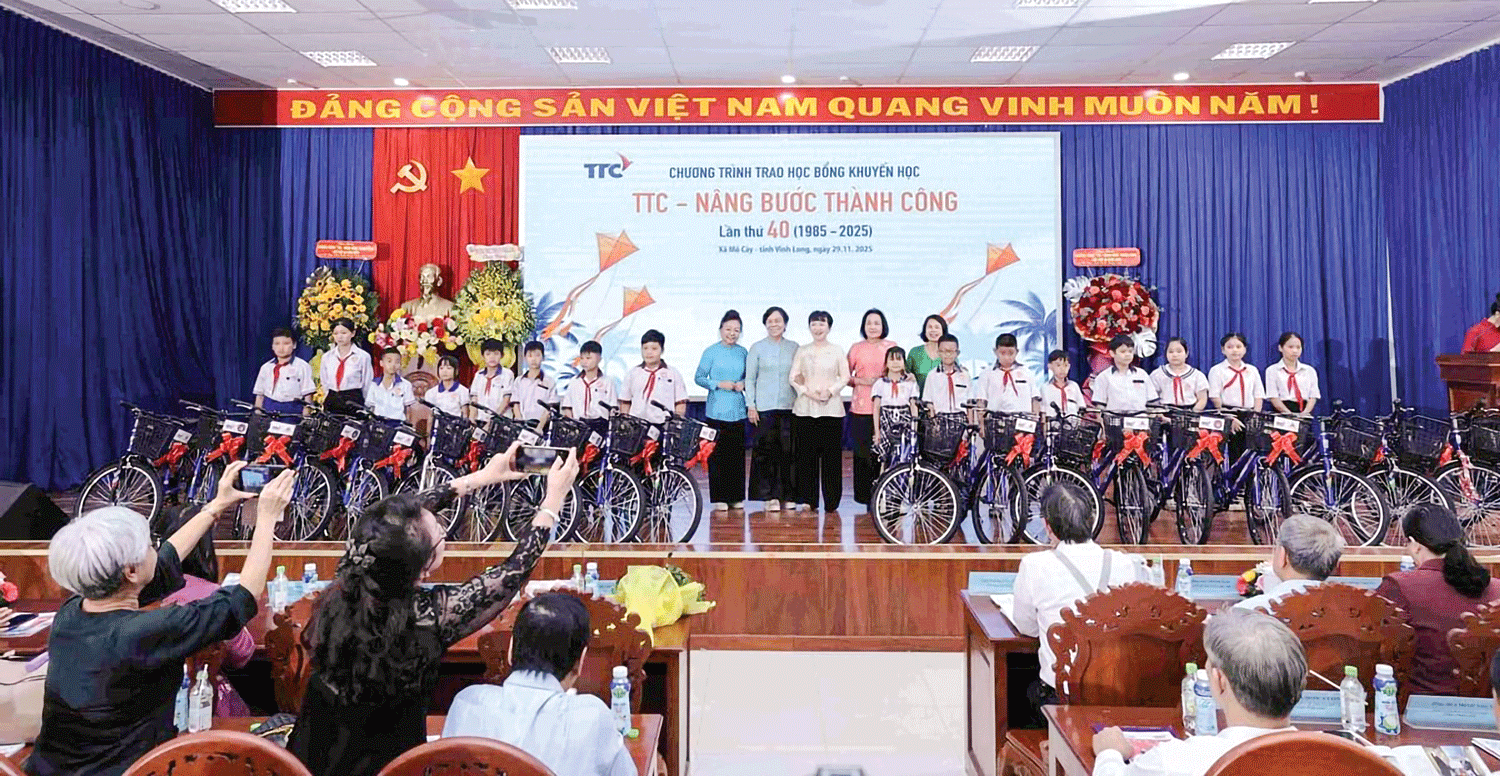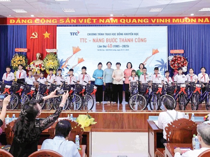 Các thành viên nhóm Sharing trong buổi trao tặng học bổng và xe đạp trị giá 100 triệu đồng cho học sinh nghèo tỉnh Vĩnh Long năm 2025. Ảnh: CTV
