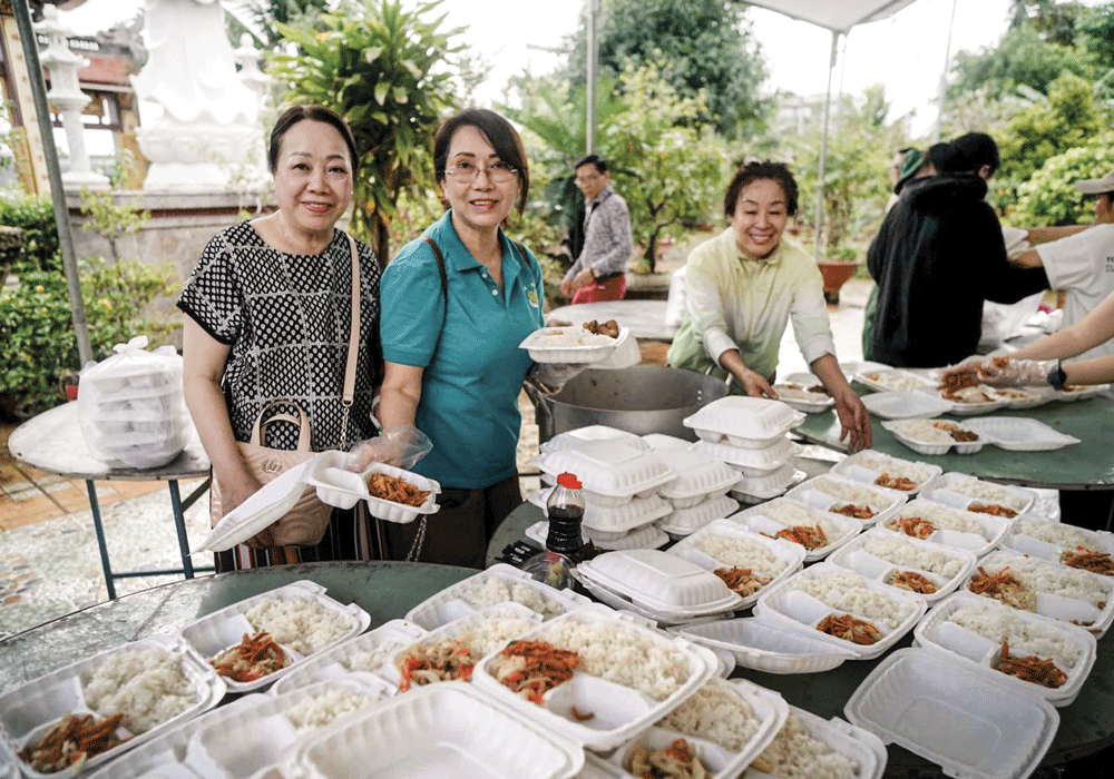 Không chỉ chuyển tài, vật của các mạnh thường quân đến bếp dã chiến, giữa những ngày cao điểm của cơn bão số 13, chị Tranh và các thành viên trong nhóm Sharing như chị Thúy Nga (Kiến Á), chị Phượng (Sala) và các bạn của Saigon Co.opmart địa phương… đã trực tiếp cùng các sư thầy, sư cô lao động cật lực để nấu và phân phối hơn 80.000 suất ăn, hơn 100.000 phần quà thiết yếu đến với bà con vùng lũ và lực lượng cứu hộ, cứu nạn.
