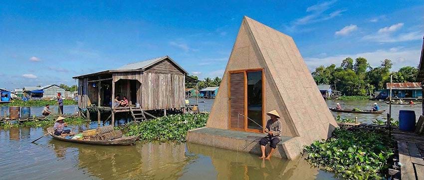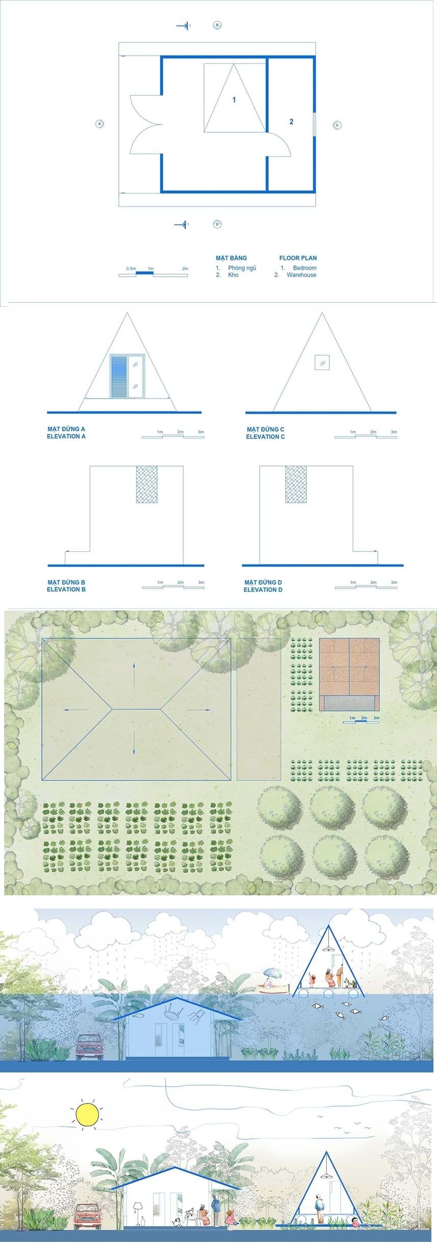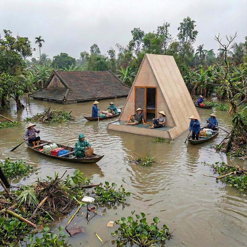 Ngày thường, căn nhà nhỏ ấy chỉ như một bungalow vườn nằm an nhiên bên bãi cỏ, cửa mở ra gió và mùi tre nước. Nhưng khi lũ về, toàn bộ cấu trúc nhẹ nhàng tách khỏi nền, nổi lên theo mực nước như một cái tổ vững chãi. Hình tam giác cân – tưởng như đơn giản – lại là dáng hình an toàn nhất giữa bão gió, trọng tâm thấp, không mái đua, không có chỗ cho gió bám vào để quật ngã. Một dáng hình mà chỉ cần nhìn thôi đã cảm thấy vững tâm.
