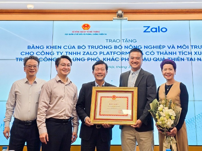 Đại diện Zalo nhận bằng khen của Bộ Nông nghiệp và Môi trường vì những đóng góp cho công tác phòng chống thiên tai tại Việt Nam.