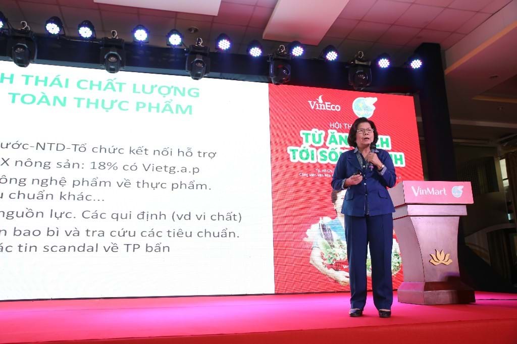 “Từ ăn sạch đến sống xanh” có sự tham gia của nhiều diễn giả khách mời uy tín trong ngành như Bà Phạm Khánh Phong Lan – Trưởng ban Quản lý An toàn thực phẩm TP.HCM (ảnh trên), bà Vũ Kim Hạnh – Chủ tịch Hội doanh nghiệp Hàng Việt Nam chất lượng cao (ảnh dưới) cùng đại diện của Hội Liên hiệp phụ nữ TP.HCM, Sở Công thương và Trung tâm dinh dưỡng TP.HCM đã mang đến nhiều thông tin bổ ích về vệ sinh an toàn thực phẩm, dinh dưỡng đúng cách, giúp những người tham dự, đặc biệt là phụ nữ, được trang bị thêm kiến thức để chủ động lựa chọn thực phẩm an toàn bảo vệ sức khoẻ cho bản thân và gia đình.