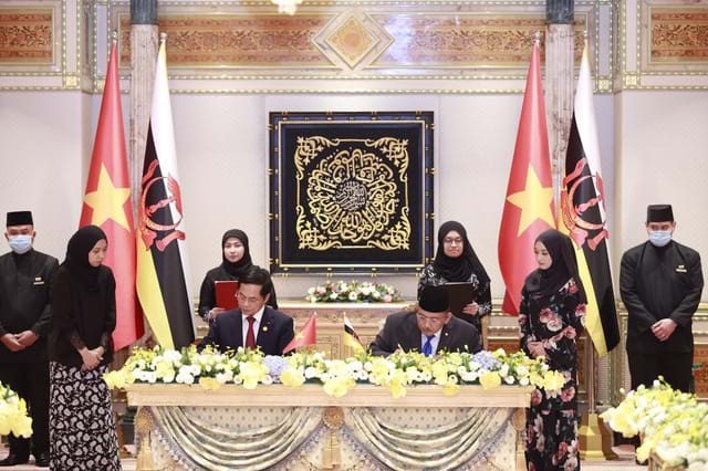 Kết thúc Hội đàm, hai nhà Lãnh đạo đã chứng kiến lễ ký kết và trao đổi Chương trình hành động triển khai quan hệ Đối tác Toàn diện 2023-2027 và Công hàm trao đổi Thỏa thuận Miễn thị thực cho người mang hộ chiếu ngoại giao và hộ chiếu công vụ giữa Việt Nam và Brunei Darussalam.