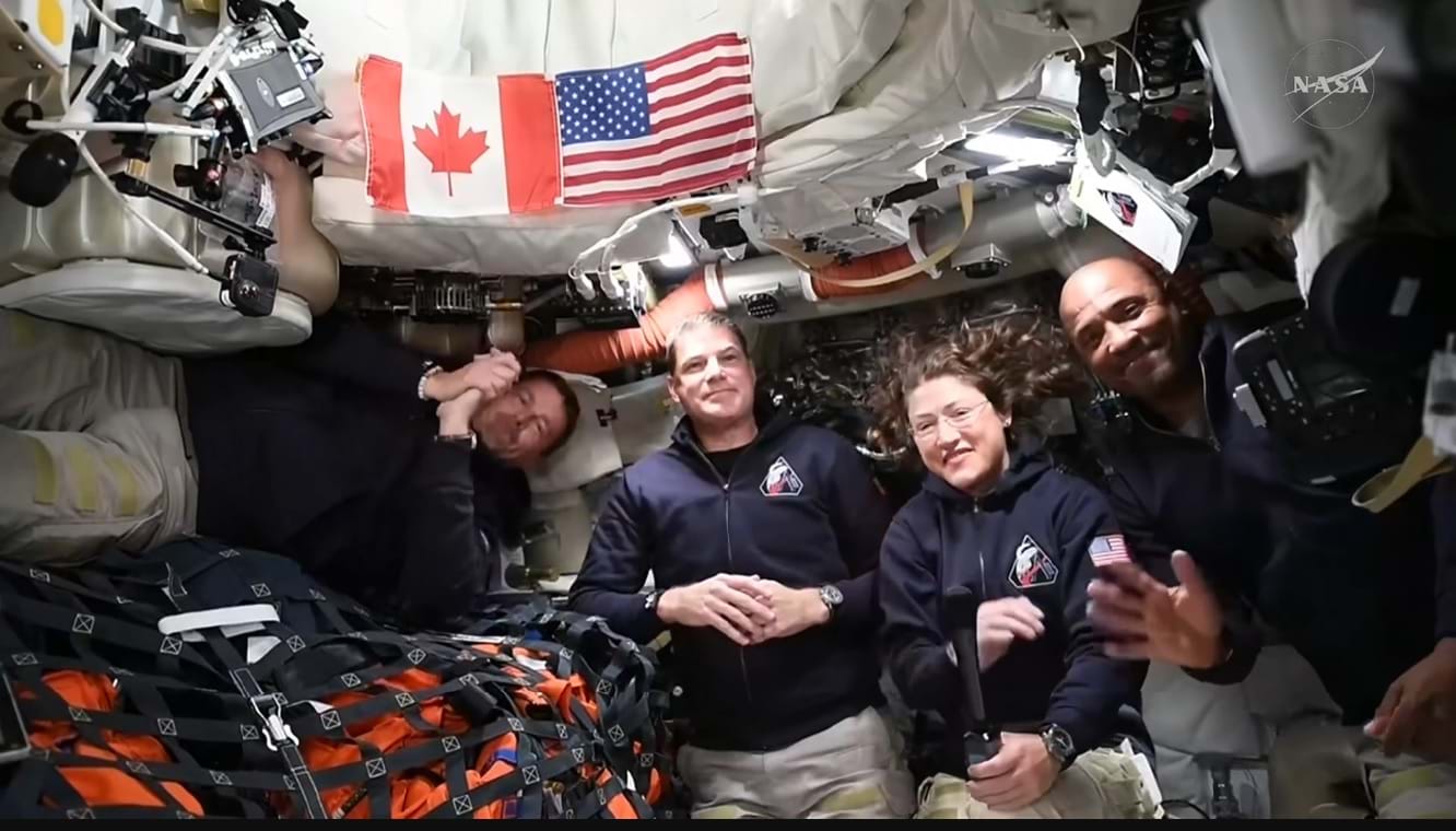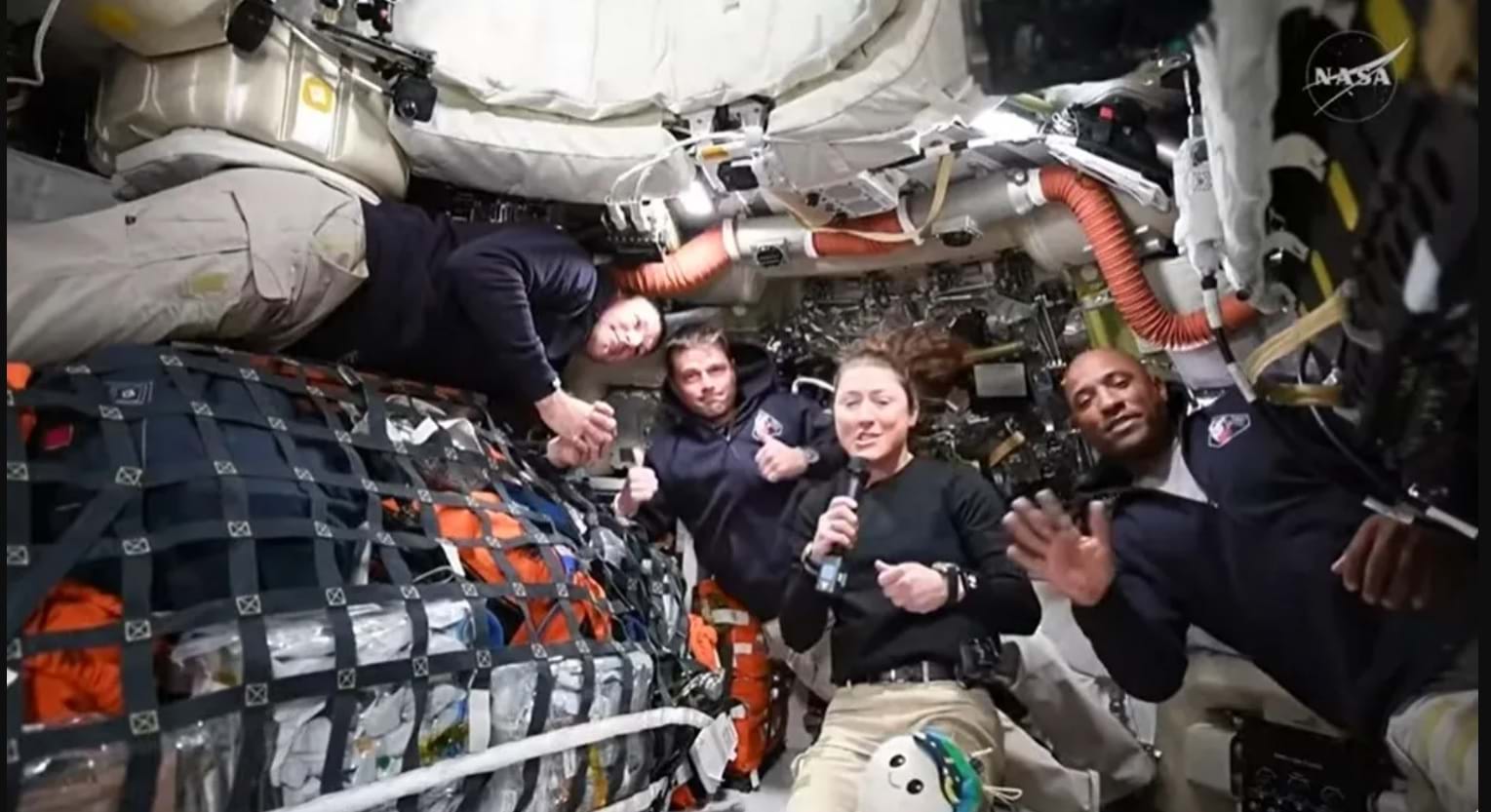 Phi hành đoàn Artemis II – gồm phi hành gia NASA Reid Wiseman (ngoài cùng bên trái), phi hành gia CSA Jeremy Hansen (giữa bên trái) và các phi hành gia NASA Christina Koch (giữa bên phải) và Victor Glover (bên phải) tham gia một sự kiện truyền thông trực tiếp trên tàu vũ trụ Orion trong Ngày bay thứ 4, và được phát sóng trực tiếp trên kênh truyền hình 24/7 của cơ quan này.