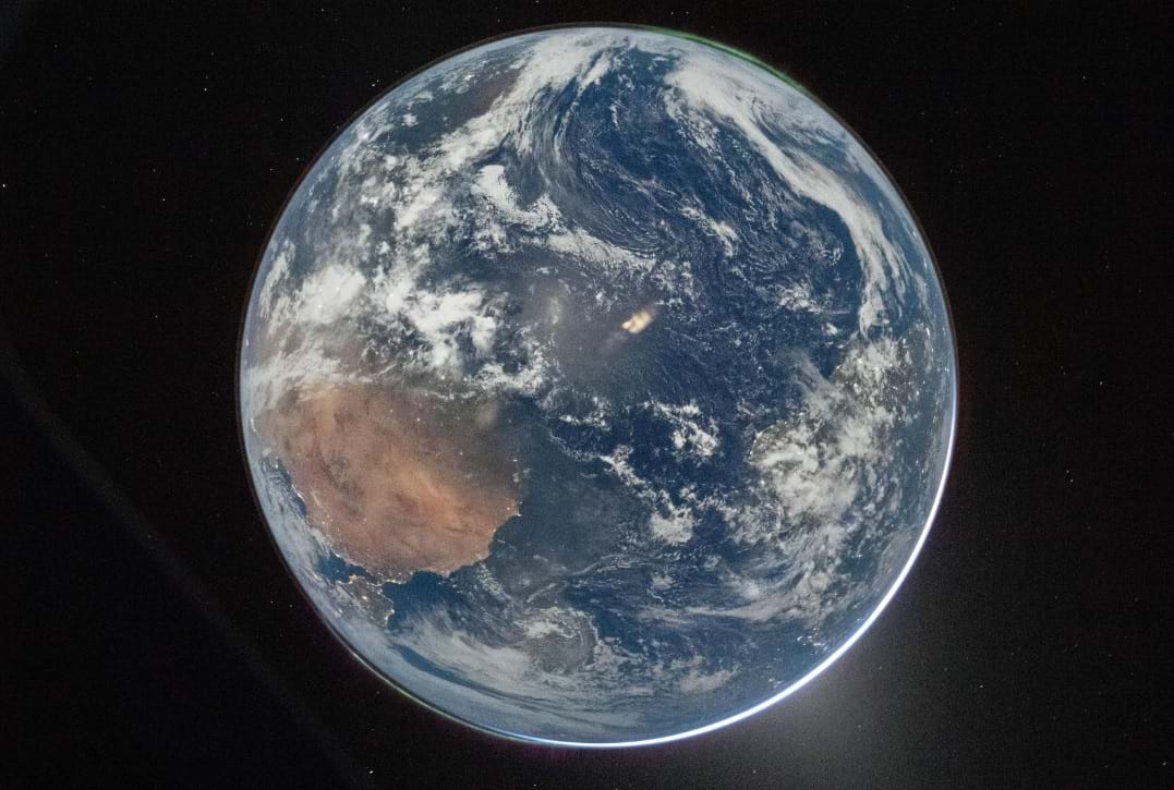 Cột khói thải ra từ tên lửa Artemis II đang tan dần trong khí quyển Trái đất được chụp từ Trạm Vũ trụ Quốc tế. Trạm vũ trụ đang bay ở độ cao 263 dặm trên Đại Tây Dương, phía tây bắc Puerto Rico vào thời điểm chụp bức ảnh này.