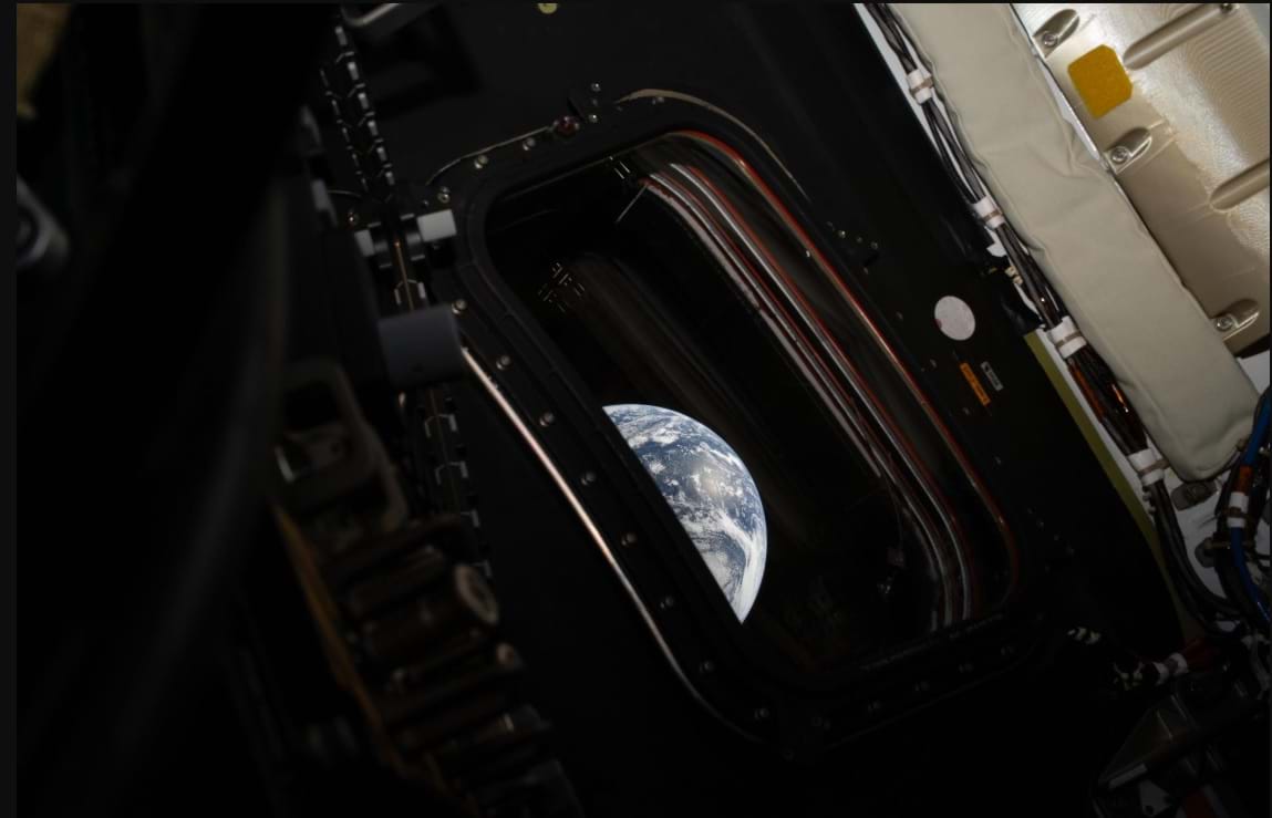 Nữ phi hành gia Christina Koch, nhìn ra ngoài qua một trong những cửa sổ chính của tàu vũ trụ Orion, hướng về Trái Đất, khi phi hành đoàn đang di chuyển về phía Mặt Trăng.