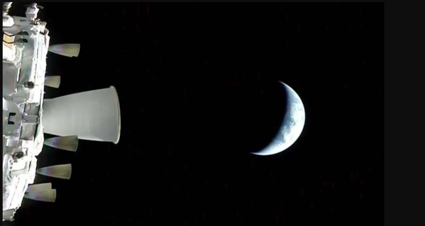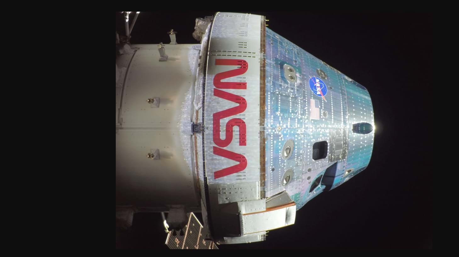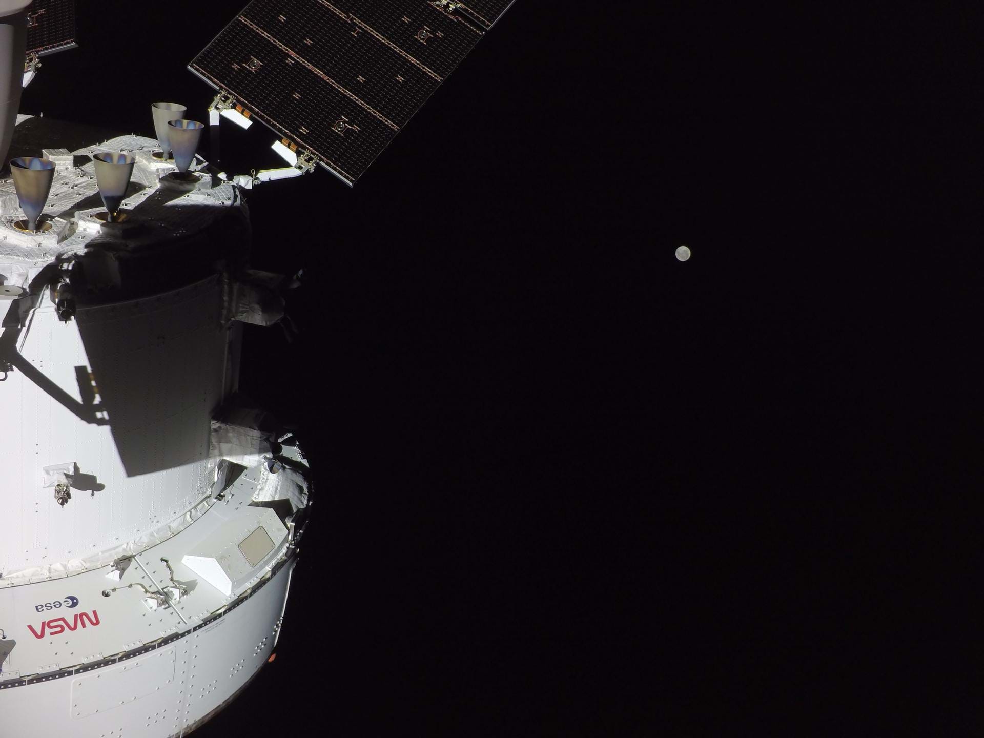 Bức ảnh này cho thấy tàu vũ trụ Orion với Mặt Trăng ở phía xa, do một camera ở đầu một trong những cánh pin mặt trời của tàu Orion chụp.
