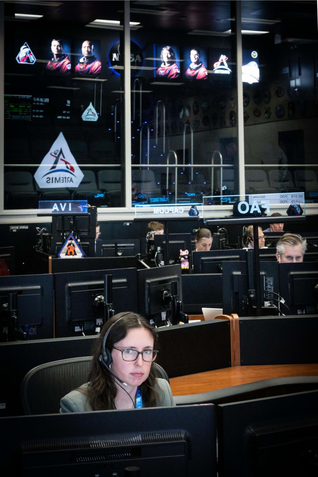 Sĩ quan khoa học Kelsey Young của sứ mệnh Artemis II đang theo dõi các hoạt động khoa học tại bảng điều khiển SCIENCE mới trong Trung tâm Điều khiển Sứ mệnh của NASA.