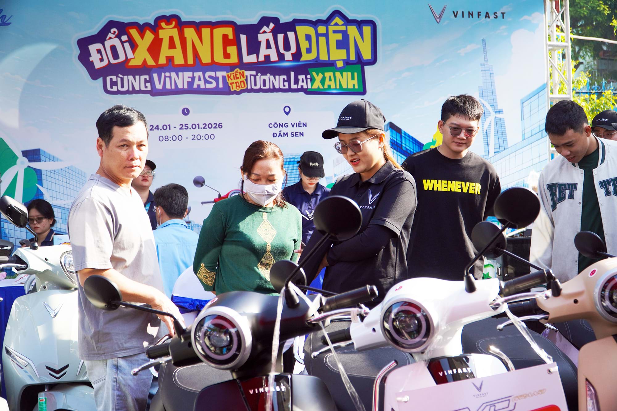 Trong 2 ngày cuối tuần (24 - 25.1), Công viên Đầm Sen (phường Bình Thới, TP.HCM) - một trong những địa điểm diễn ra sự kiện “Đổi xăng lấy điện - Cùng VinFast kiến tạo tương lai xanh” - sôi động hơn thường lệ. Dàn xe máy điện VinFast nhiều phân khúc, phù hợp với nhiều đối tượng khách hàng nhanh chóng trở thành tâm điểm nóng được nhiều người trải nghiệm.