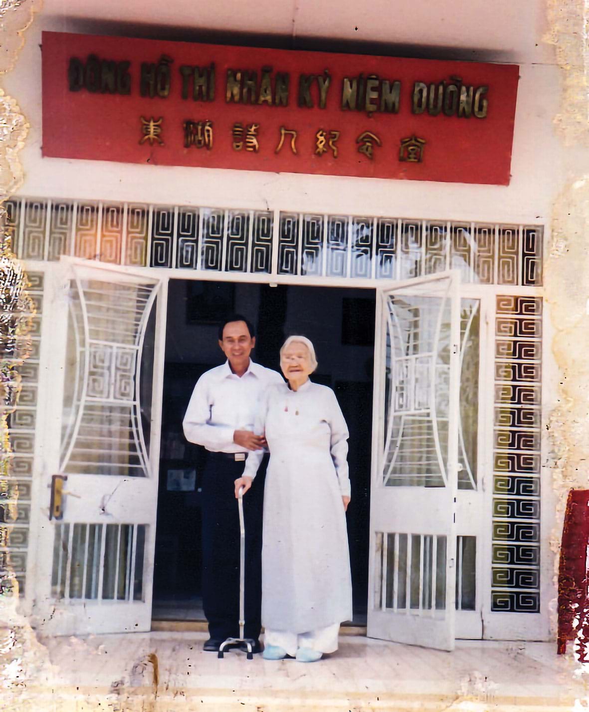 Nữ sĩ Mộng Tuyết (những năm cuối đời) và nhà giáo Lâm Hữu Tài trước Đông Hồ thi nhân kỷ niệm đường. Ảnh tư liệu