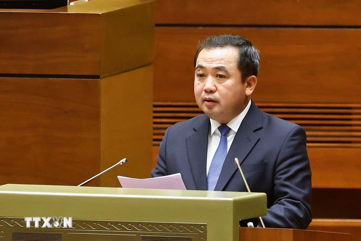 Bộ trưởng Bộ Nông nghiệp và Môi trường Trần Đức Thắng, thừa ủy quyền của Thủ tướng Chính phủ trình bày Tờ trình dự thảo Nghị quyết của Quốc hội quy định một số cơ chế, chính sách tháo gỡ khó khăn, vướng mắc trong tổ chức thi hành Luật Đất đai. Ảnh: Doãn Tấn/ TTXVN
