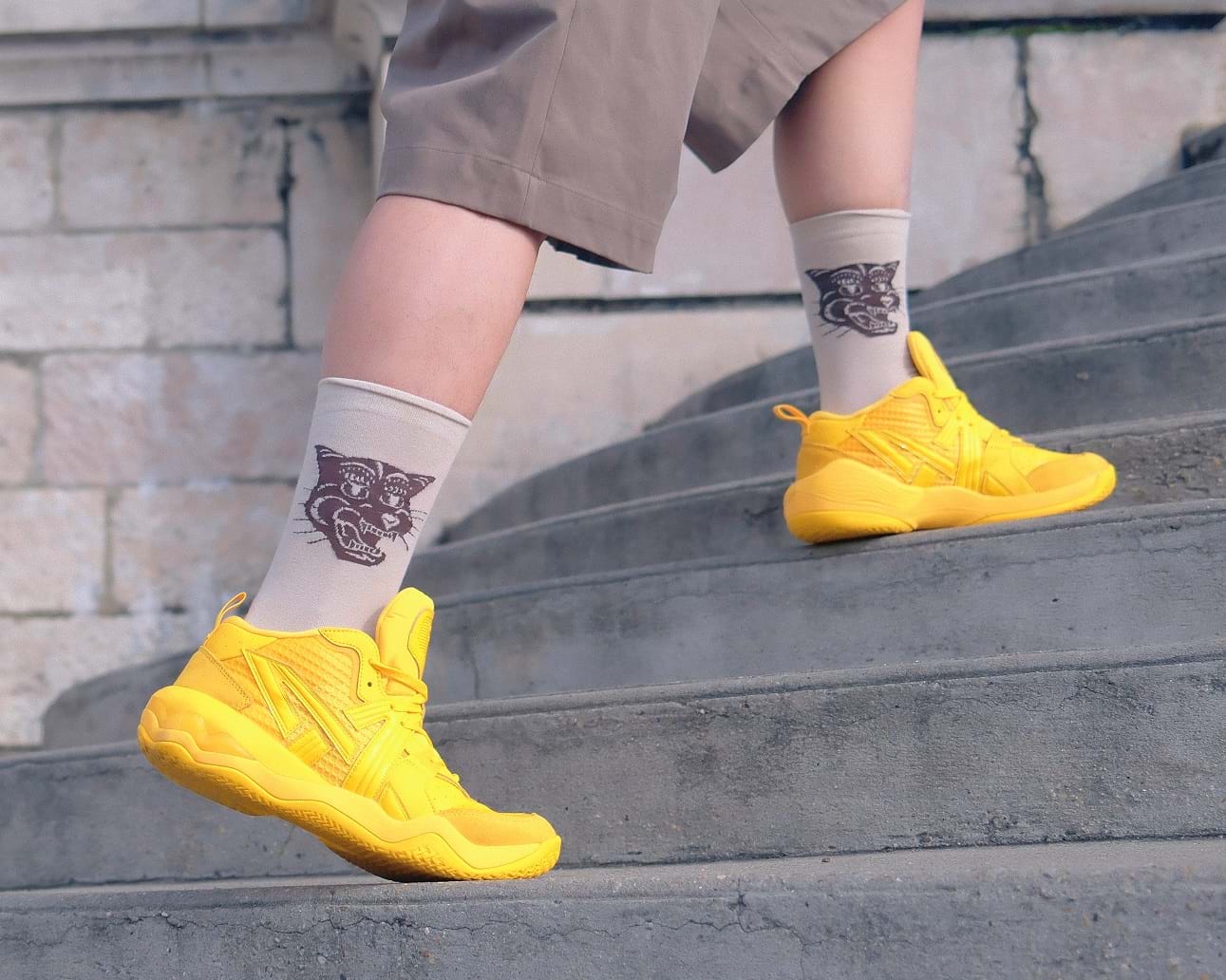 Thiết kế được nâng tầm bởi những chấm phá độc đáo: chất liệu dệt đục lỗ đặc trưng của giày bóng rổ giao thoa cùng chi tiết đế trong mờ (translucent), tạo nên một kết cấu bề mặt ấn tượng. Đây chính là điểm nhấn phá cách, hiện đại, làm nổi bật phong cách cho tổng thể trang phục.