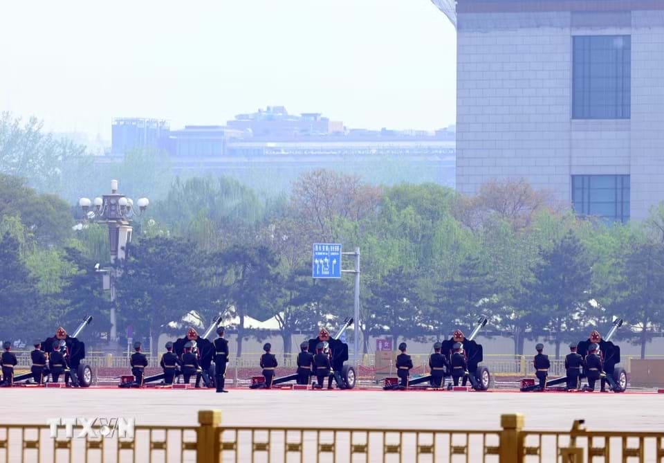 Nghi thức bắn 21 loạt đại bác tại Lễ đón trọng thể Tổng Bí thư, Chủ tịch nước Tô Lâm và Phu nhân thăm cấp Nhà nước đến Trung Quốc. Ảnh: Thống Nhất/TTXVN