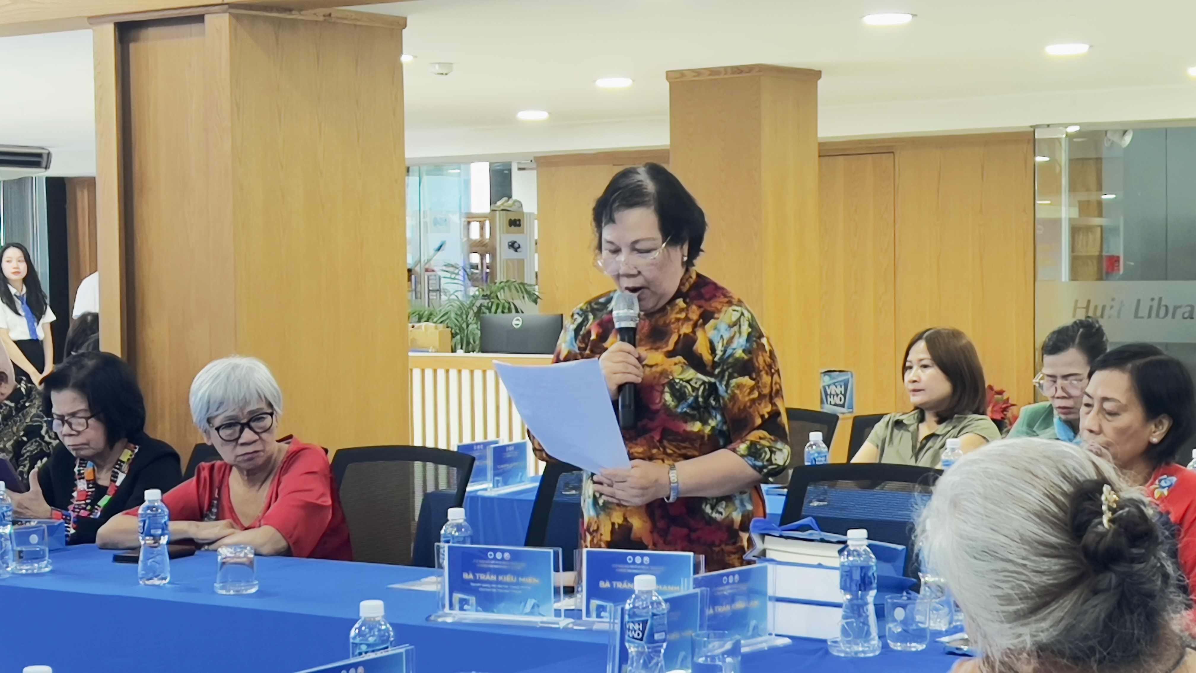 Bác sĩ Trần Kiều Miên đại diện gia đình phát biểu tại lễ tặng sách.