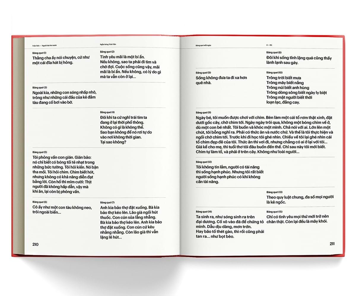 Không dừng ở nội dung, cuốn sách còn gây chú ý ở hình thức. Ấn phẩm được thiết kế hiện đại bởi Duy Đào – nghệ sĩ Việt Nam đầu tiên được đề cử giải Grammy ở hạng mục Thiết kế album xuất sắc nhất. Nhờ đó, Trần Tiến – Người hát thơ mình mang dáng dấp của một cuốn artbook, có giá trị sưu tầm, với nhiều hình ảnh, tư liệu báo chí, mở ra những “cánh cửa ký ức” về quá khứ của nhạc sĩ.