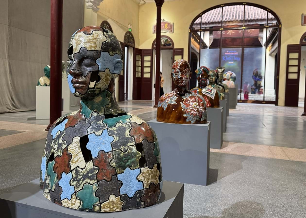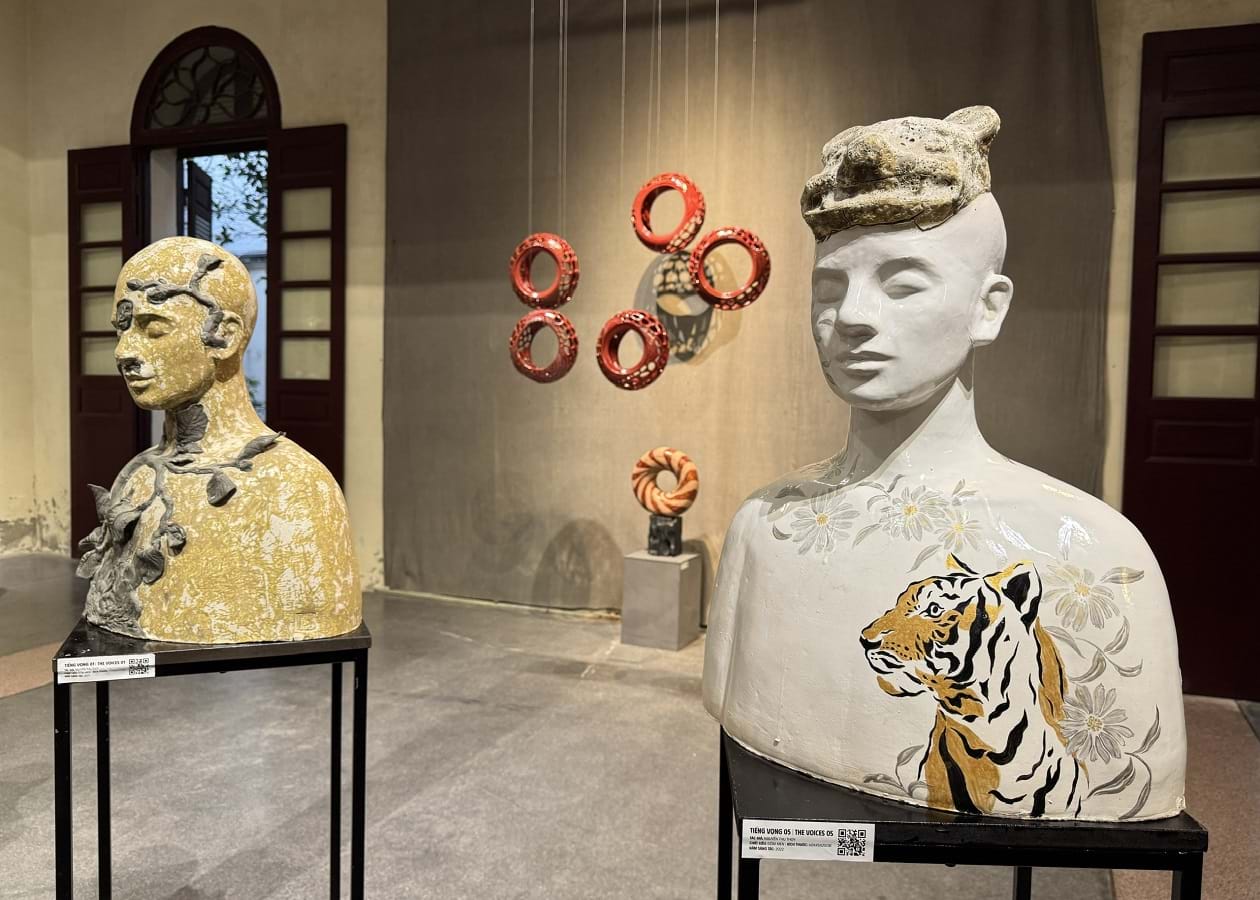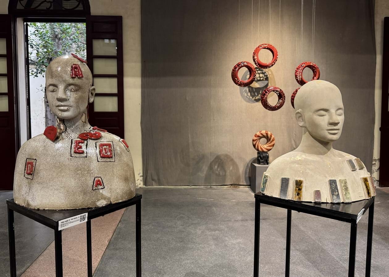 Triển lãm gây ấn tượng mạnh với hai bộ tác phẩm trọng tâm, thể hiện tư duy nghệ thuật táo bạo và kỹ thuật điêu luyện. Trong đó, bộ tác phẩm Tiếng vọng là chuỗi tượng bán thân được chế tác bằng phương pháp đổ rót khuôn với sự hỗ trợ của các nghệ nhân lành nghề tại Bát Tràng. Mỗi bức tượng mang một diện mạo và lớp ký ức riêng biệt. Nghệ sĩ đã dũng cảm thử nghiệm hàng trăm mảng màu men khác nhau trên cùng một bề mặt – điều mà ngay cả những nghệ nhân lâu năm cũng e ngại vì rủi ro hư hỏng trong lò nung.