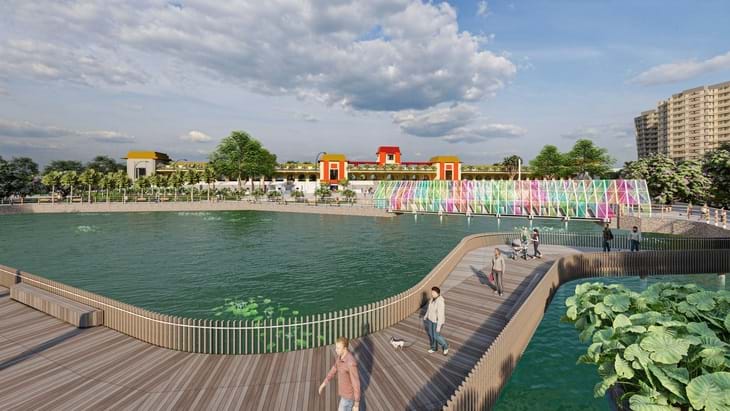 Phối cảnh cây xanh, thảm cỏ và khu vực hồ nước cảnh quan của công viên. Ảnh: BTC