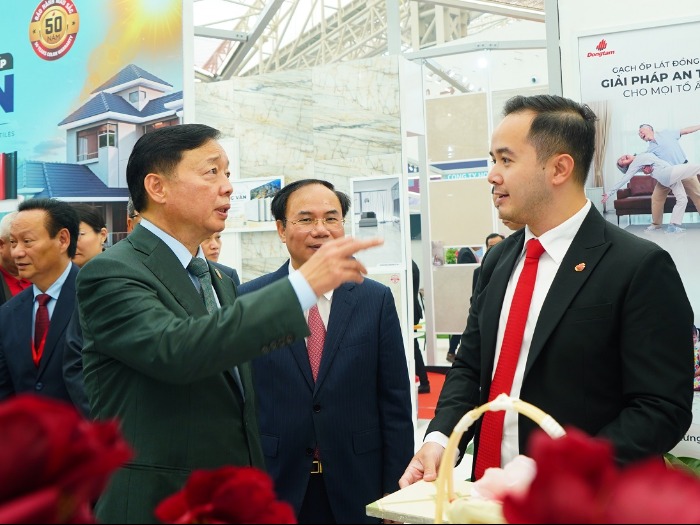 Ngay trong ngày khai mạc tại Trung tâm Triển lãm Việt Nam (VEC, Đông Anh), gian hàng của Dongtam Group đã vinh dự đón tiếp Phó Thủ tướng Trần Hồng Hà cùng lãnh đạo Bộ Xây dựng đến tham quan, tìm hiểu các dòng vật liệu theo định hướng giảm phát thải carbon.