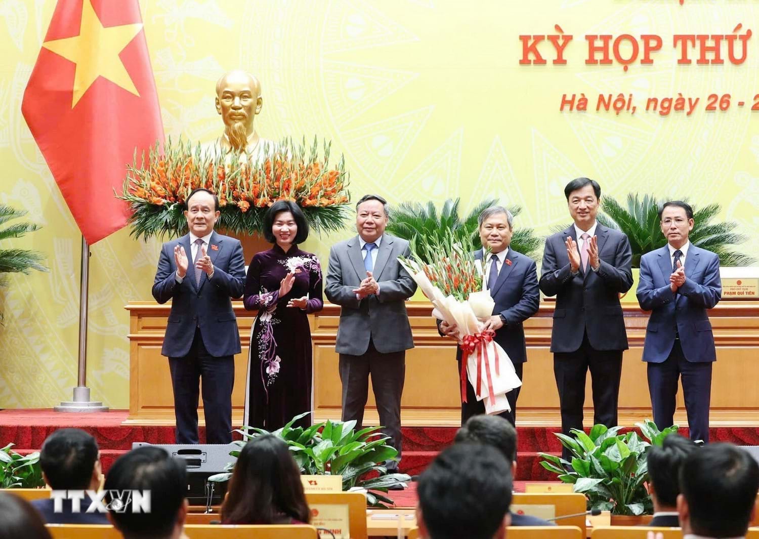 Đồng chí Nguyễn Duy Ngọc, Ủy viên Bộ Chính trị, Bí thư Thành ủy Hà Nội và các đại biểu chúc mừng tân Chủ tịch Ủy ban nhân dân thành phố Hà Nội Vũ Đại Thắng. Ảnh: An Đăng/TTXVN