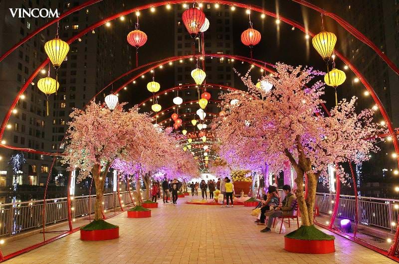 Tại Vincom Mega Mall Times City, mọi người có thể cùng nhau lưu lại những hình ảnh Tết hân hoan, đón may mắn ở Cây Tài Lộc và con đường hoa đào ven hồ nhạc nước lãng mạn.