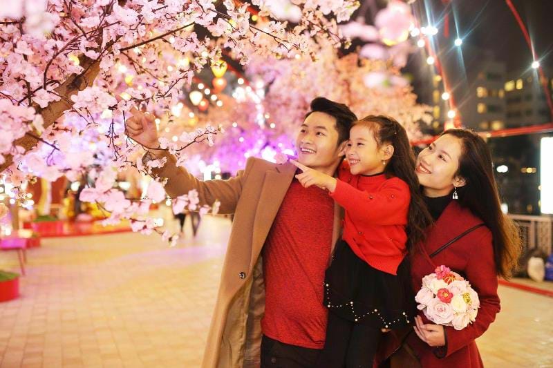 Con đường hoa đào tại quảng trường Vincom Mega Mall Times City là nơi ghi lại những khoảnh khắc đẹp của các gia đình.