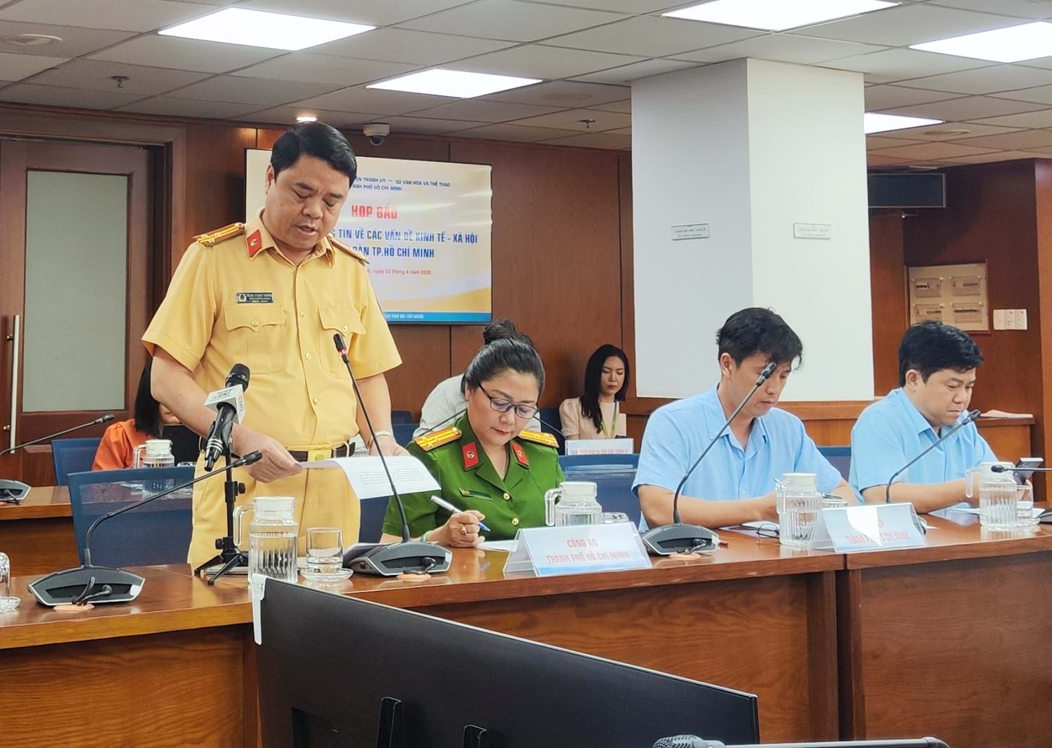 Thượng tá Phạm Quang Trưởng, Phó Trưởng Phòng CSGT, Công an TPHCM, cung cấp thông tin tại buổi họp báo. Ảnh: T.D.