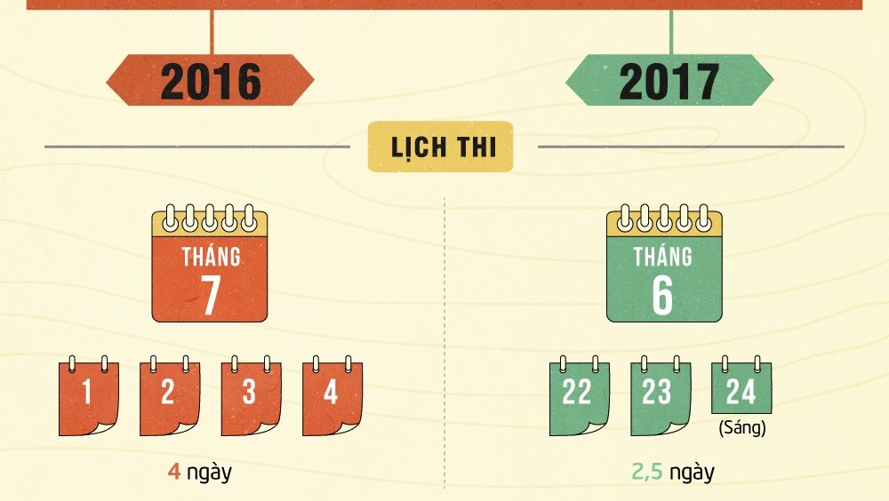 Kỳ thi THPT quốc gia 2017 diễn ra trong 2,5 ngày với 5 bài thi. Trừ Ngữ văn, các môn thi bằng hình thức trắc nghiệm.