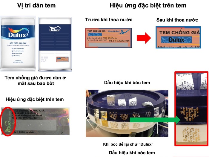 Riêng với dòng sản phẩm bột trét, tem chống giả được dán ở mặt sau bao bì và tích hợp tính năng thoa nước để hiện chữ, giúp người mua dễ dàng nhận diện ngay tại điểm bán.