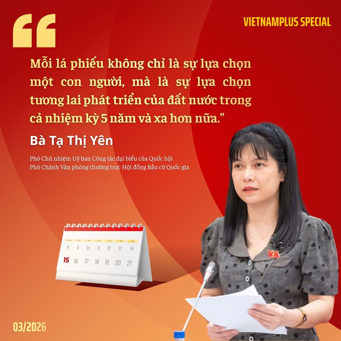 “Việc lựa chọn đúng và trúng đại biểu Quốc hội có ý nghĩa mang tính quyết định đối với chất lượng hoạt động của cơ quan quyền lực nhà nước cao nhất (…). Do đó, mỗi lá phiếu không chỉ là sự lựa chọn một con người, mà là sự lựa chọn tương lai phát triển của đất nước trong cả nhiệm kỳ 5 năm và xa hơn nữa.”