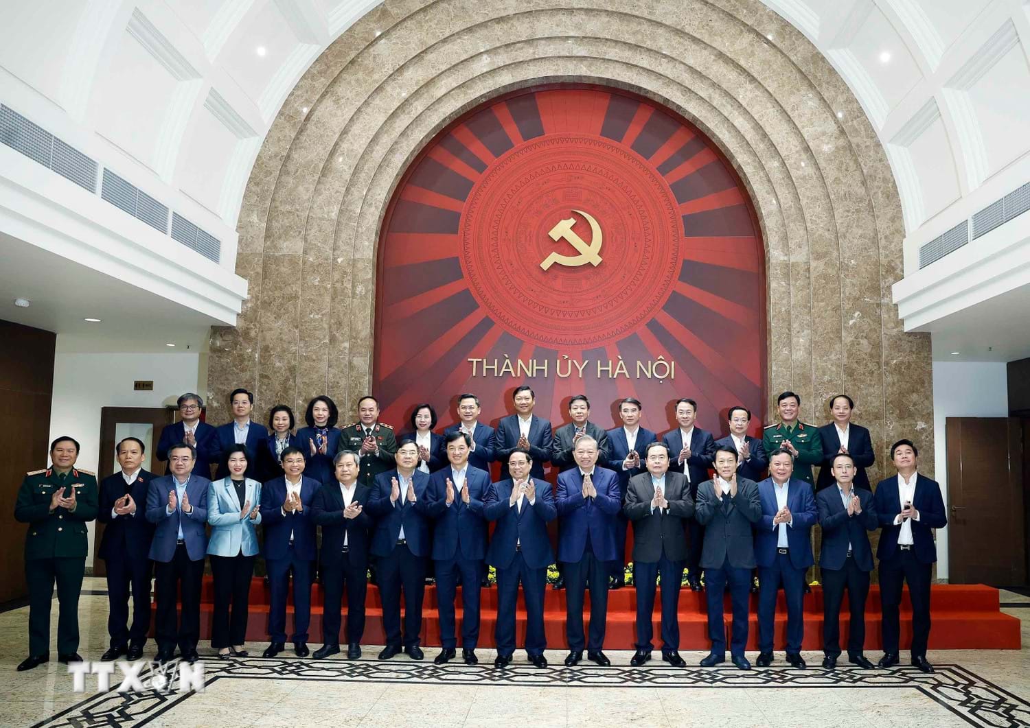 Tổng Bí thư Tô Lâm, Thủ tướng Phạm Minh Chính, Chủ tịch Quốc hội Trần Thanh Mẫn và các đại biểu tại buổi làm việc với Ban Thường vụ Thành ủy Hà Nội. Ảnh: Thống Nhất/TTXVN
