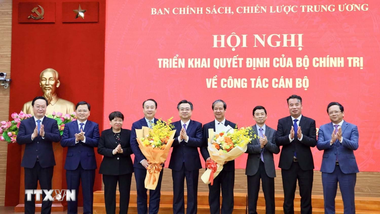 Lãnh đạo Ban Chính sách, chiến lược Trung ương tặng hoa chúc mừng đồng chí Nguyễn Kim Sơn và đồng chí Nguyễn Sỹ Hiệp. Ảnh: Phương Hoa/TTXVN