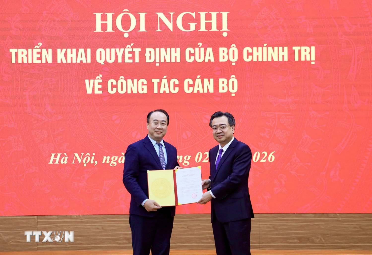 Ủy viên Bộ Chính trị, Bí thư Trung ương Đảng, Trưởng Ban Chính sách, chiến lược Trung ương Nguyễn Thanh Nghị trao Quyết định của Bộ Chính trị cho đồng chí Nguyễn Kim Sơn. Ảnh: Phương Hoa/TTXVN