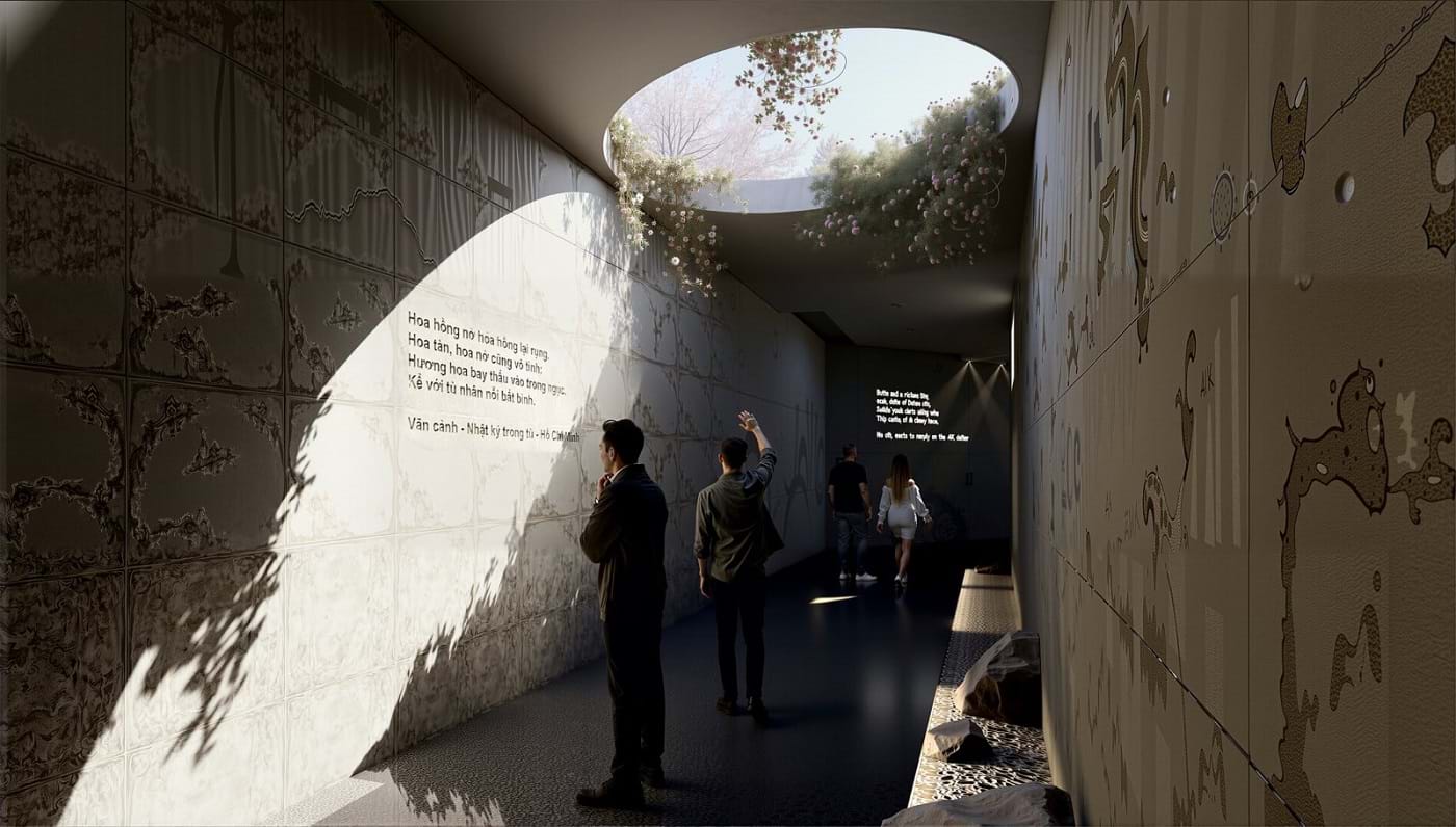 Điểm đáng chú ý là cách tổ chức không gian không đi theo lối tuyến tính quen thuộc. Không có một lộ trình tham quan cứng, nhưng người xem vẫn được dẫn dắt một cách tự nhiên thông qua cao độ, ánh sáng, vật liệu và nhịp điệu không gian... Điều này tạo ra một trải nghiệm mở, nơi mỗi người có thể tự cảm nhận câu chuyện theo cách riêng.