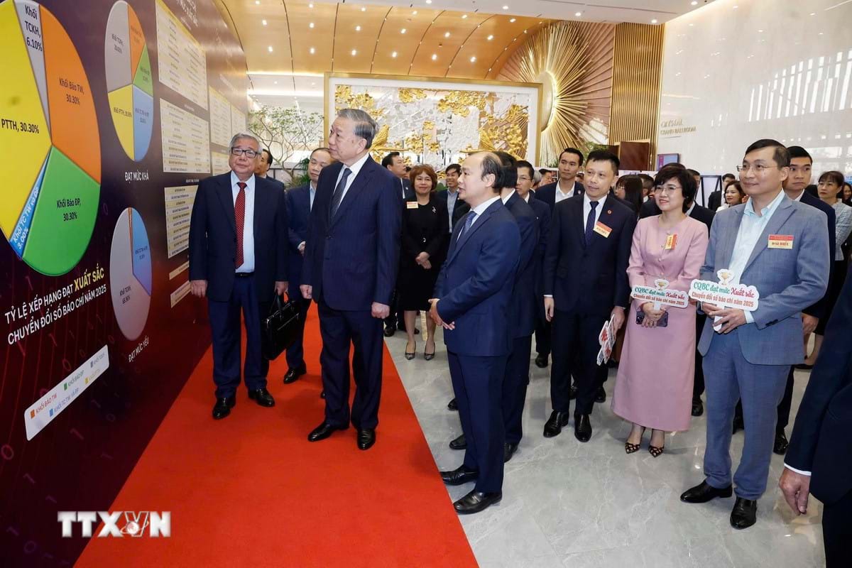 Tổng Bí thư Tô Lâm tham quan không gian trưng bày thành tựu chuyển đổi số trong báo chí. Ảnh: Thống Nhất/TTXVN