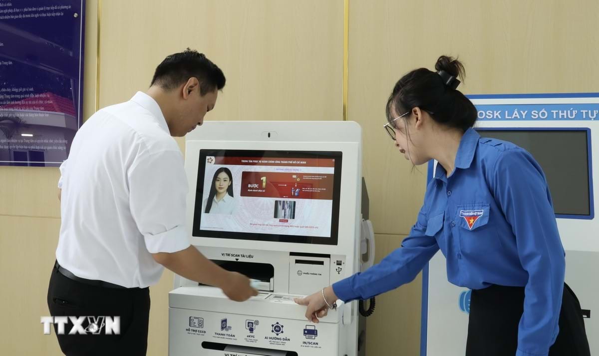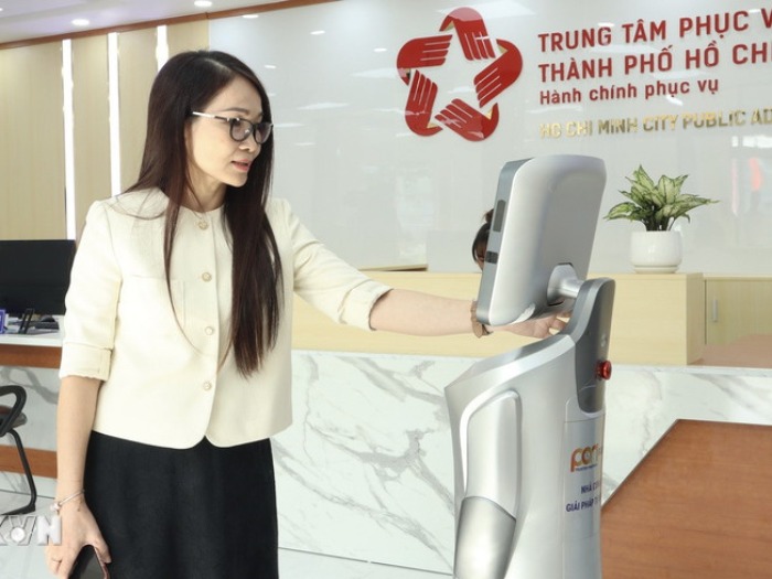 Robot "lễ tân" hướng dẫn người dân đến đúng khu vực làm thủ tục theo lĩnh vực. Ảnh: Xuân Anh/TTXVN