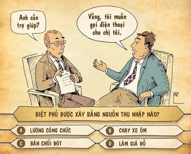 - Trật rồi bố ơi. Nếu đã đầu thai lên trển thì phải... nuôi heo nuôi gà hay chạy xe ôm, làm chổi đót mới giàu nổi!